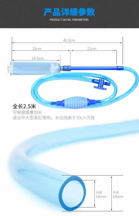 • With this tool, you can remove the dirt from the bottom of your aquarium. Supplied with long suction pipe, it is suitable for both large and small aquariums